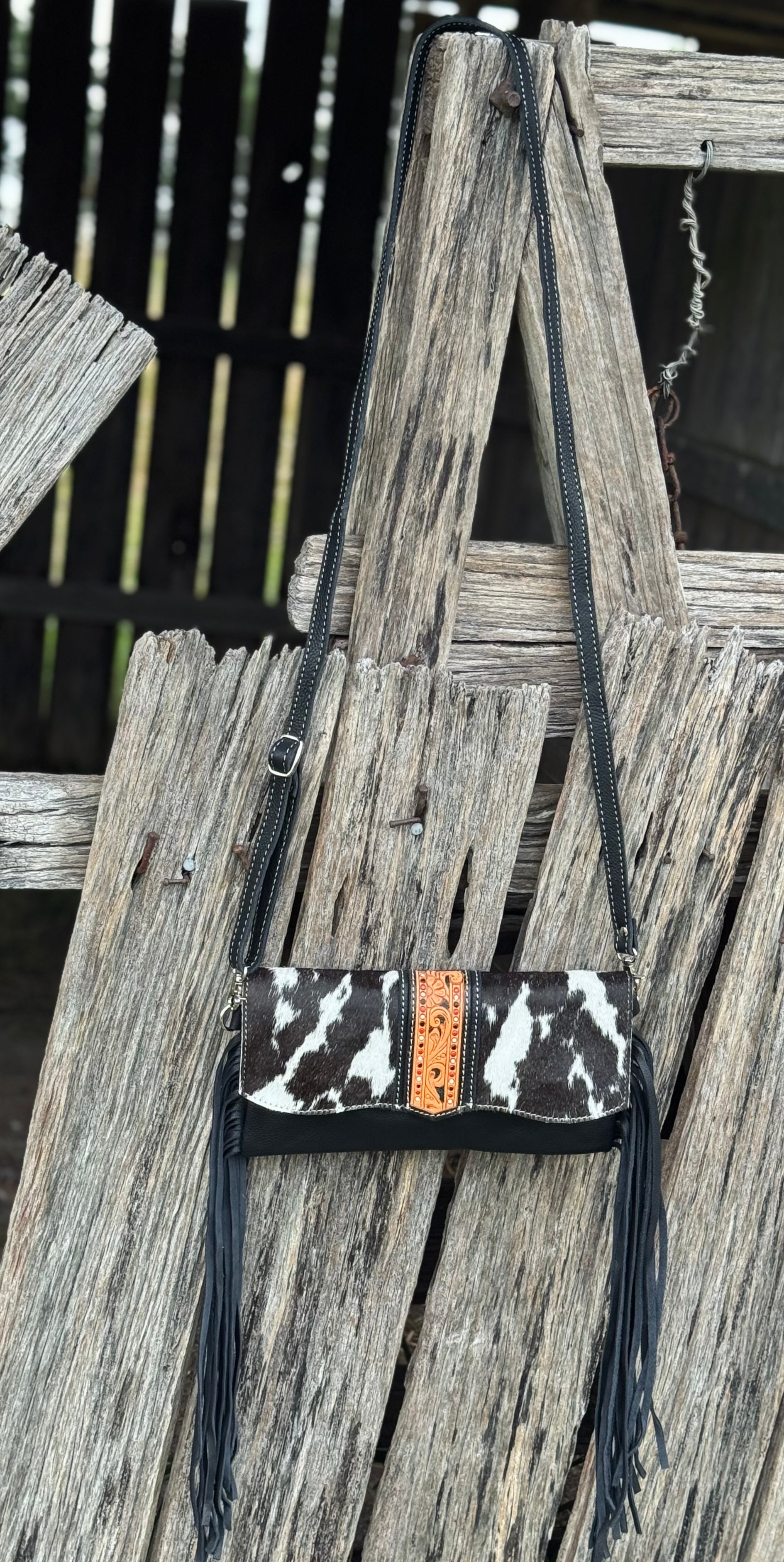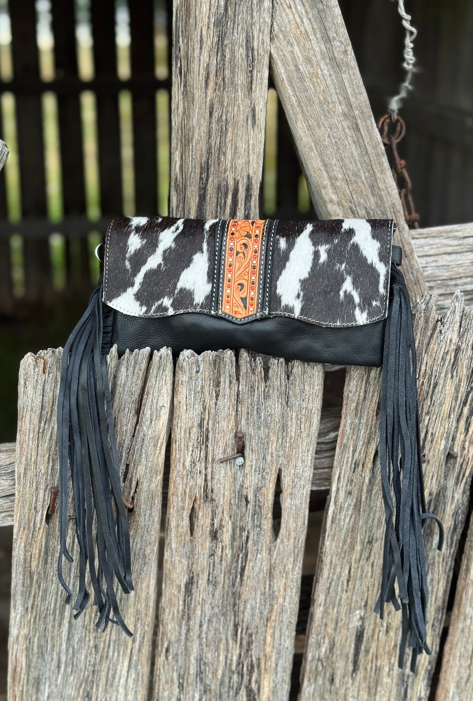 Dawson is a remarkable cowhide flap bag with intricate hand carving and hand painting details add a touch of grace and distinction to your life. The Hand Tooling and Hand Painting details on a leather strip on the cowhide flap and a long adjustable strap, along with leather fringes on the sides makes this number your to go accessory.